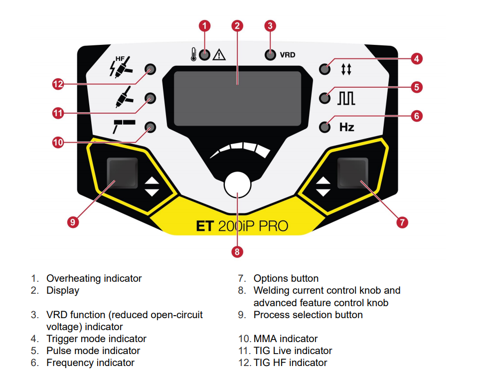 La Rogue ET proporciona varios parámetros TIG que puede ajustar fácilmente, incluyendo el preflujo de gas, la corriente de inicio, el tiempo de aceleración, el tiempo de desaceleración, la corriente de finalización y el posflujo. Todos estos se pueden programar usando el modo de 2 o 4 tiempos para un mayor control del arco. Además, La Rogue ET 200iP PRO ofrece una función de pulsación con control de corriente de fondo y ajustes de frecuencia de hasta 500 Hz para un mejor control de la entrada de calor. En el modo Stick, Hot Start o Arc Force, se pueden hacer ajustes de acuerdo con las preferencias o aplicaciones de soldadura individuales.